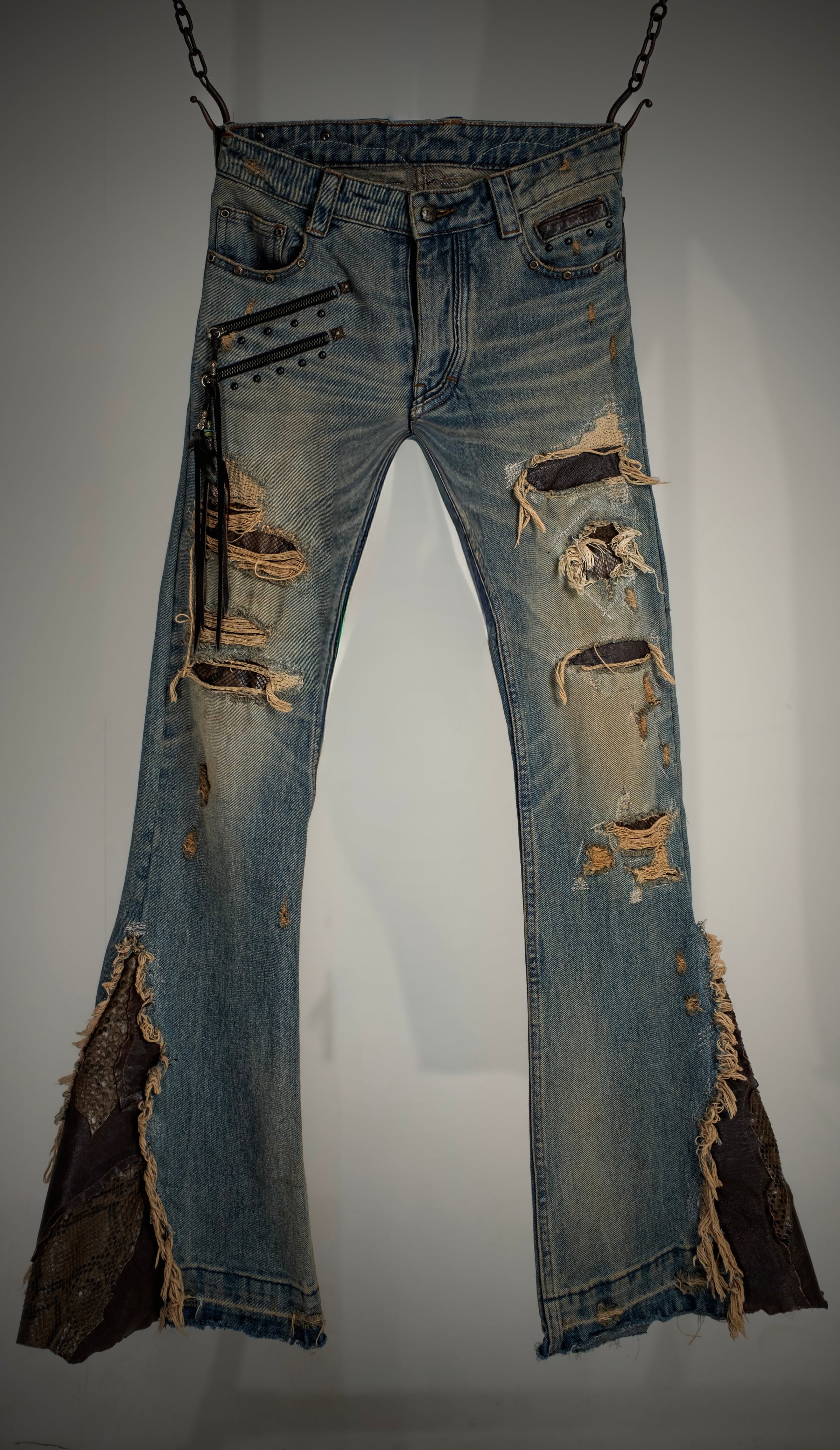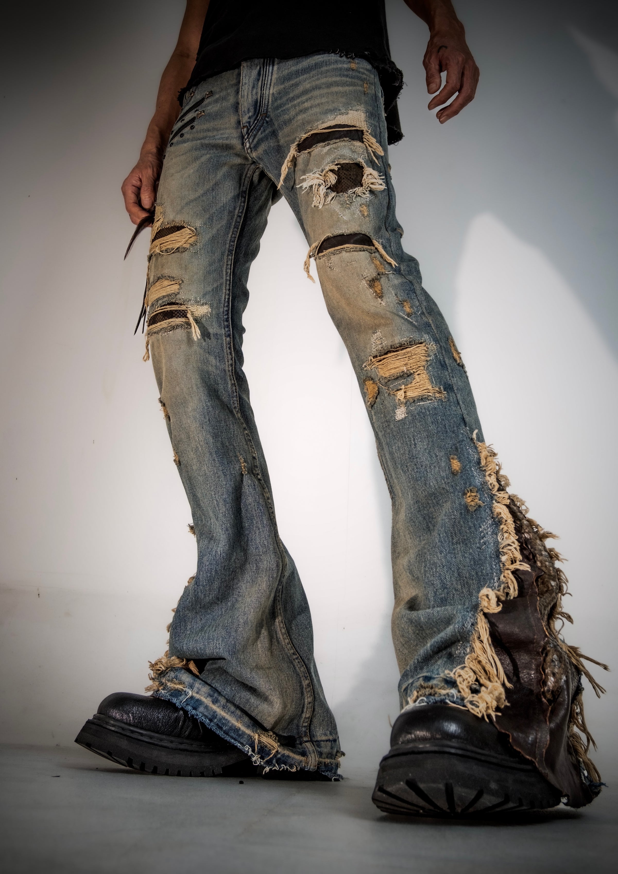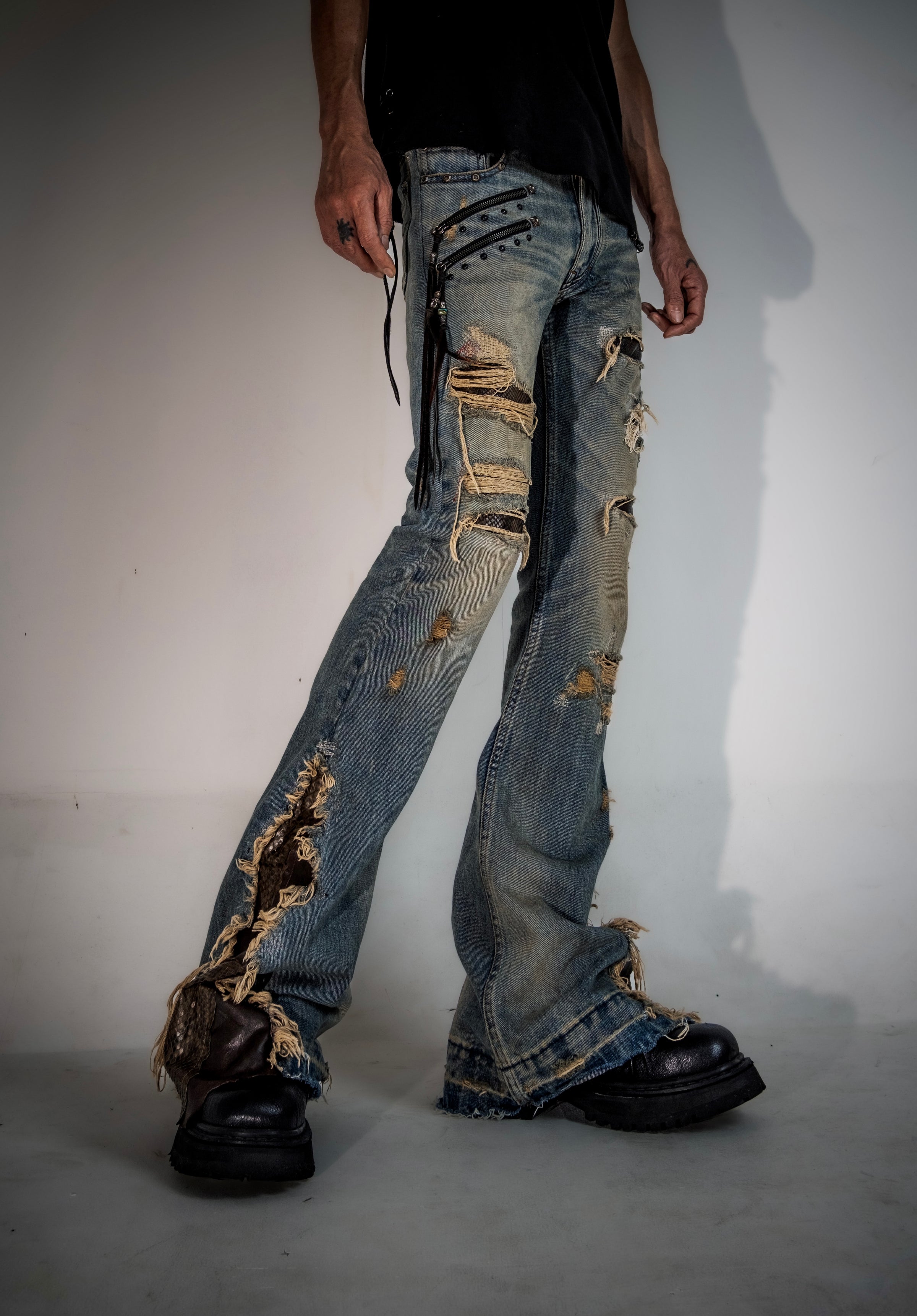 Layered through a reconstruction approach, this piece is shaped with deliberate alterations and material interplay. Leather cut details—crafted from goat leather and snakeskin—introduce contrast in both texture and tone, adding refined intensity to the design.
